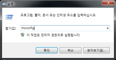 시작-실행(윈도우키+R)에서 msconfig 입력후 확인
