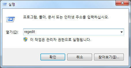 시작-실행(윈도우키+R)에서 regedit 입력후 확인 클릭