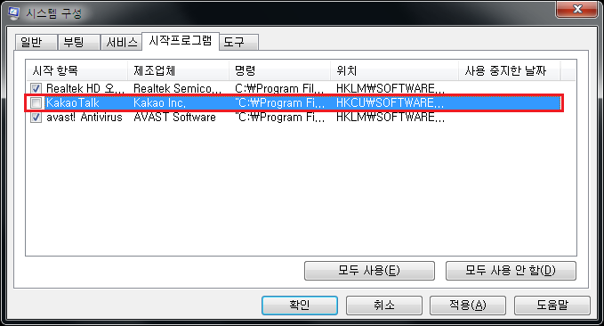 시작프로그램탭에서 사용은 안하지만 남아있는 목록에 있는걸 삭제 하고 싶은것을 확인